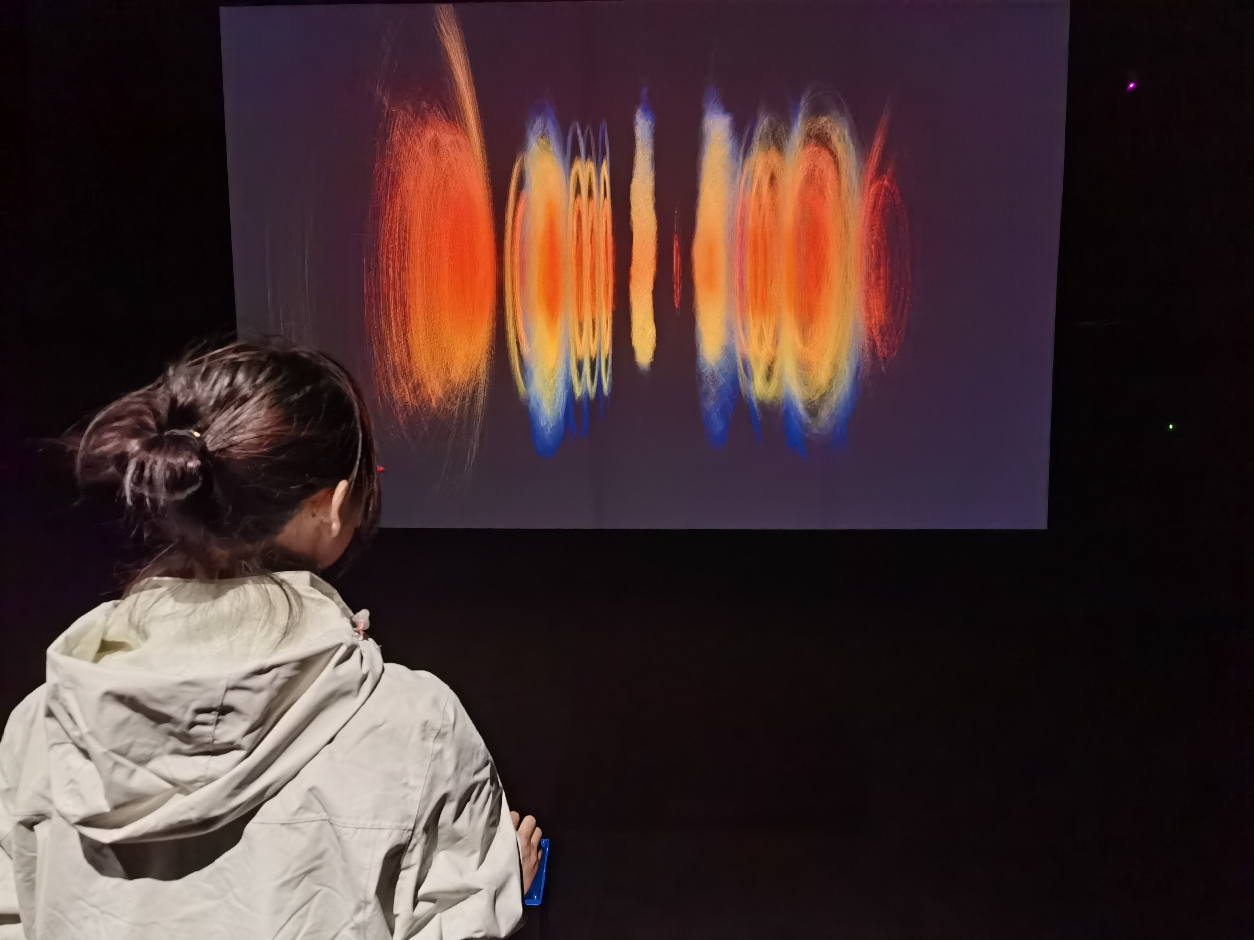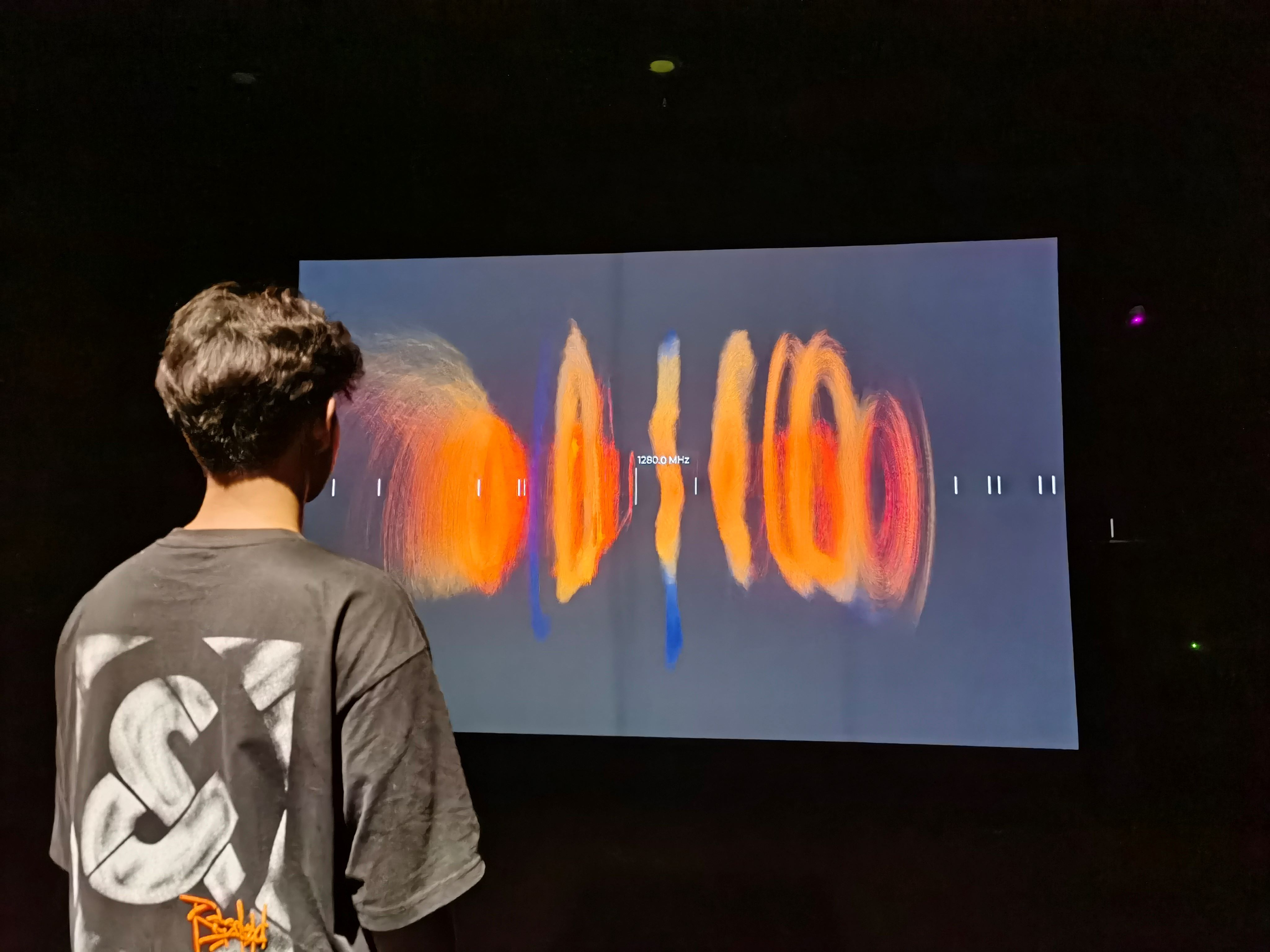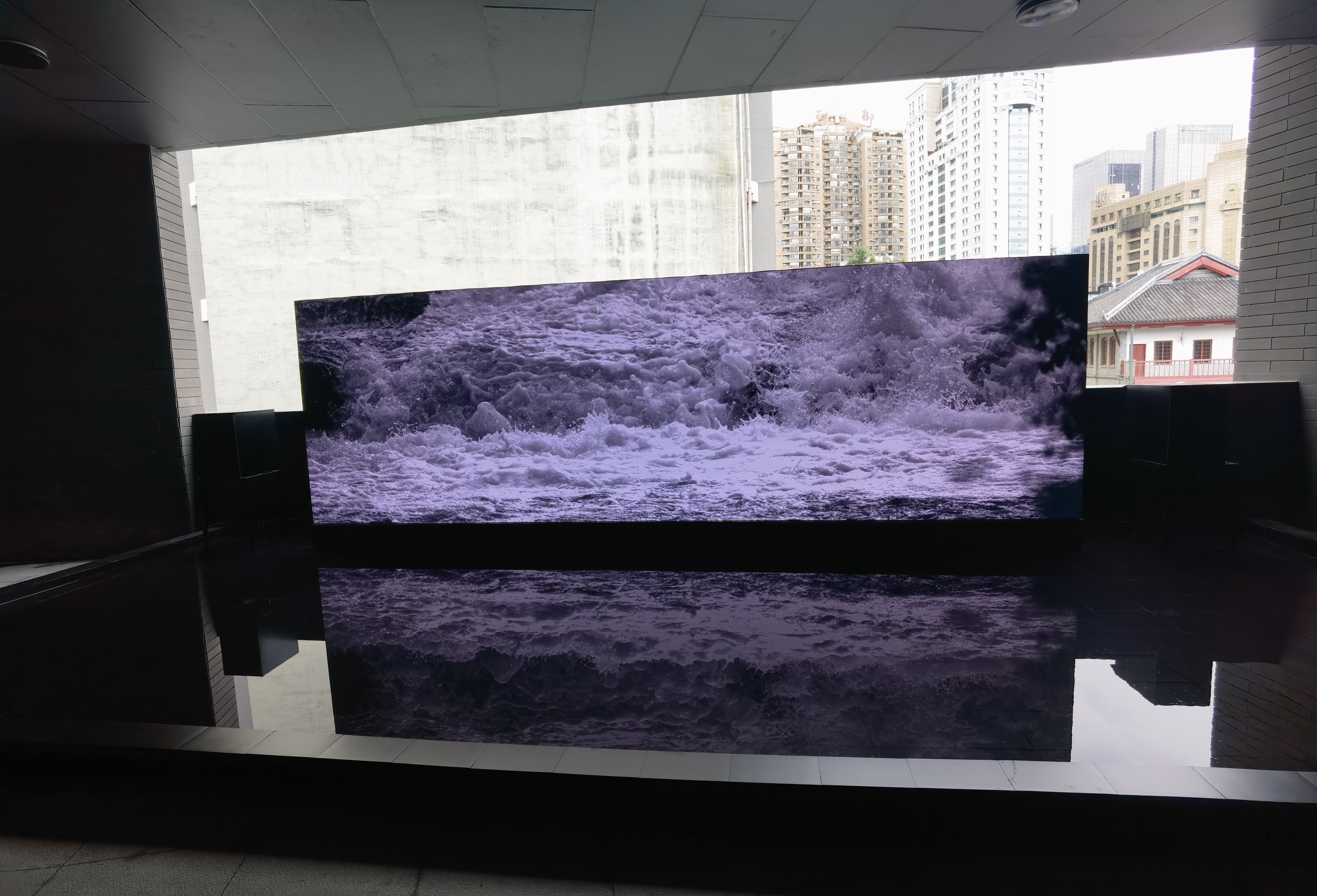 步入美术馆的第一间展厅,迎接观众的是动态的数字图像和不断转化的声音。屋顶的天线将手机、 WiFi 、数字电视、广播等人类无法感知到的电磁波信息收集起来,实时转化为影像和声音,并以 LED 显示屏和音箱的形式呈现。它们共同将成都这座城市中交错的隐形电波变为可视和可听的。观众可以通过操作屏幕前的调节器来改变所接收到的频率,多种电磁波同时以视觉和听觉化的形式呈现出来。