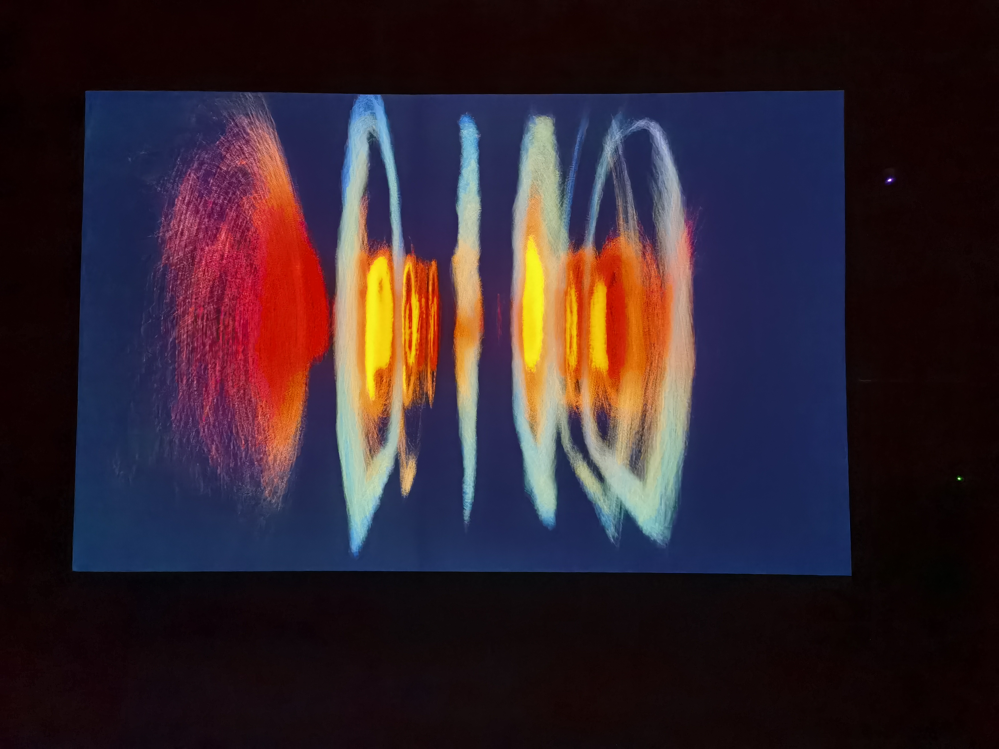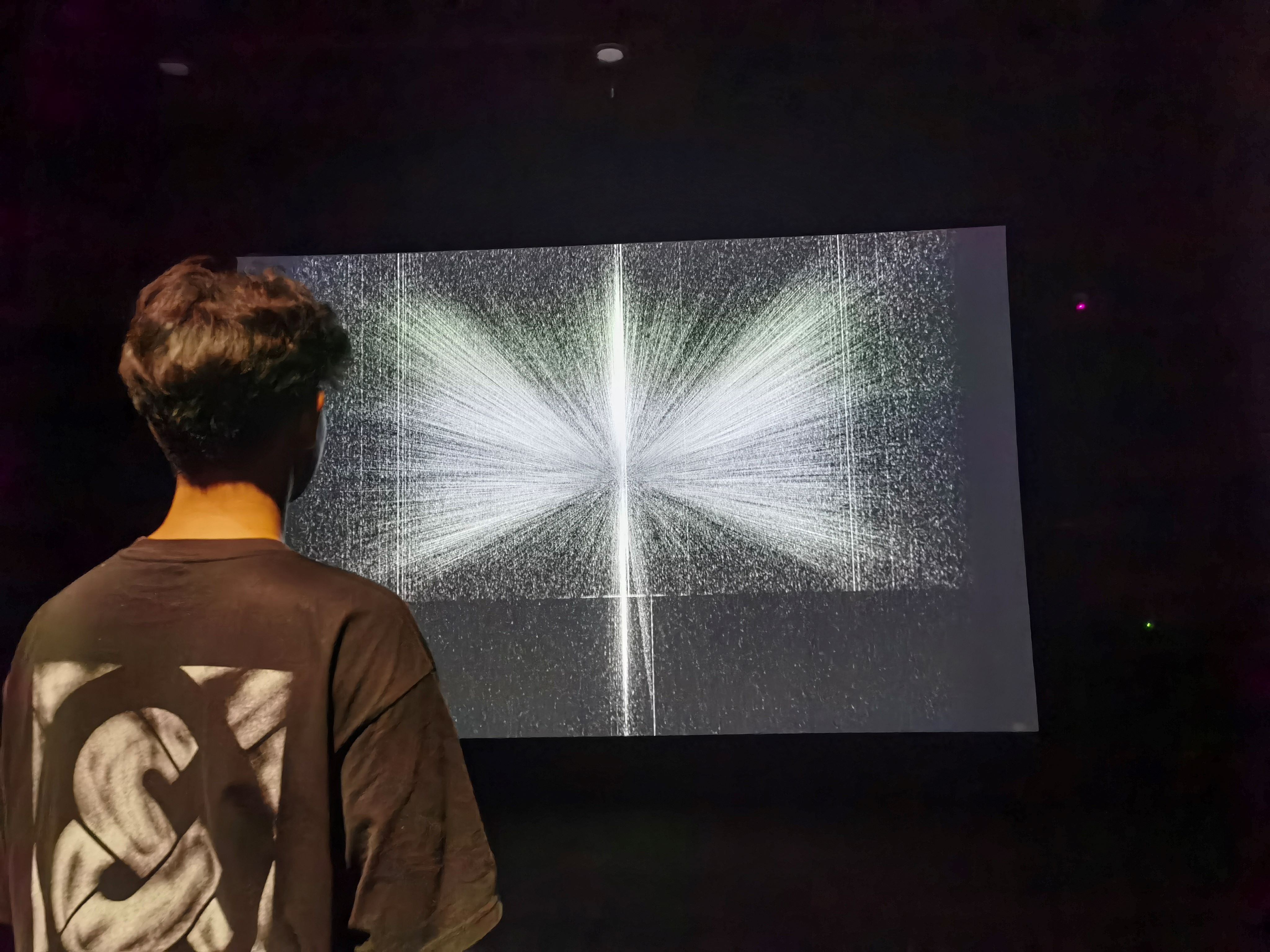 展厅左右两侧各有五台 LED 面板和音箱,前后各有两台音箱。在这个空间内,为此装置作品重新编排的《异步》乐曲,与”海啸钢琴”根据全球地震数据所弹奏的旋律交相响起。十台 LED 面板和十四台音箱所产生的光与声,使得声音在空间中的运动与传播,如物体一般以可视、可闻的方式呈现。