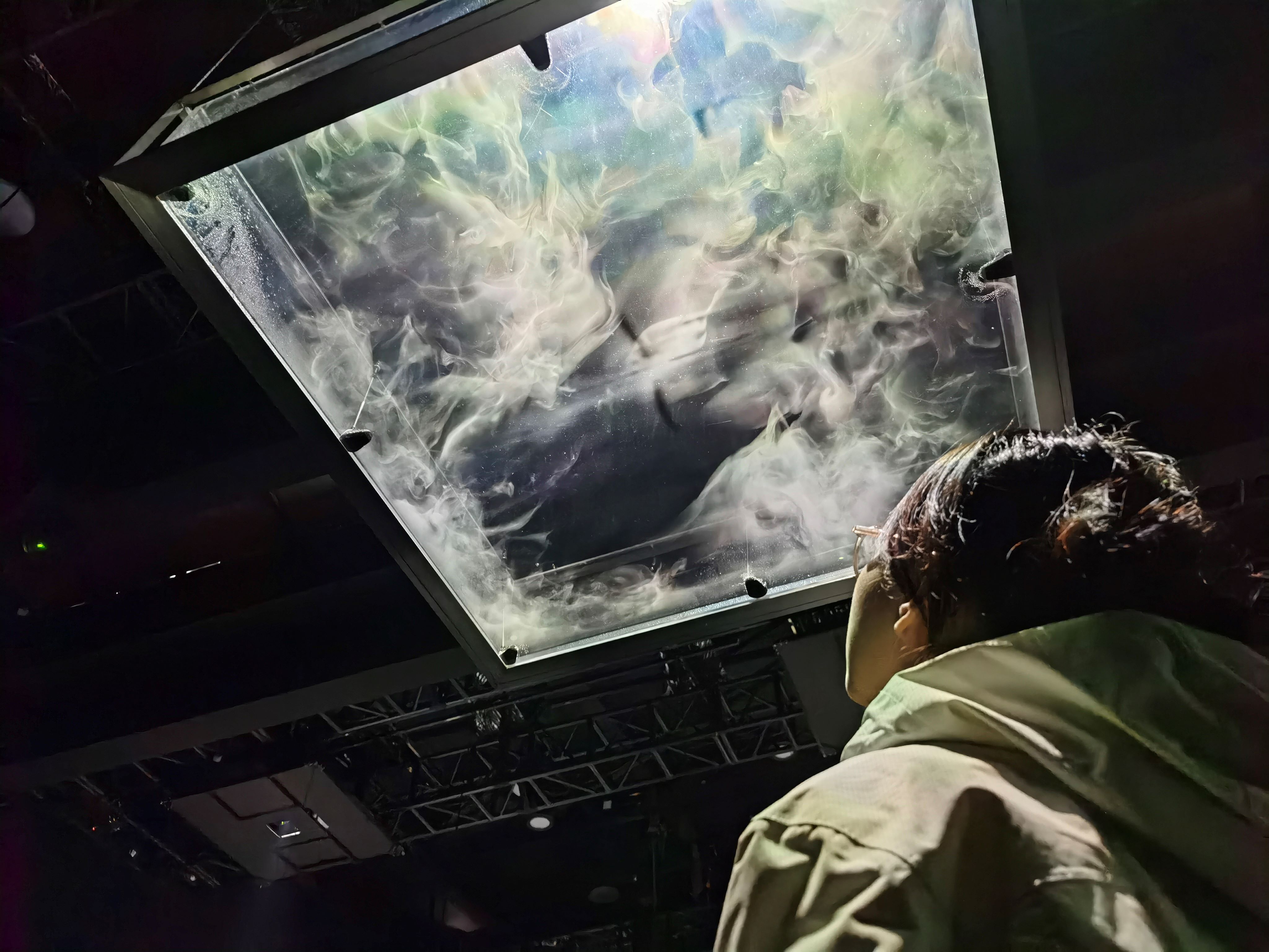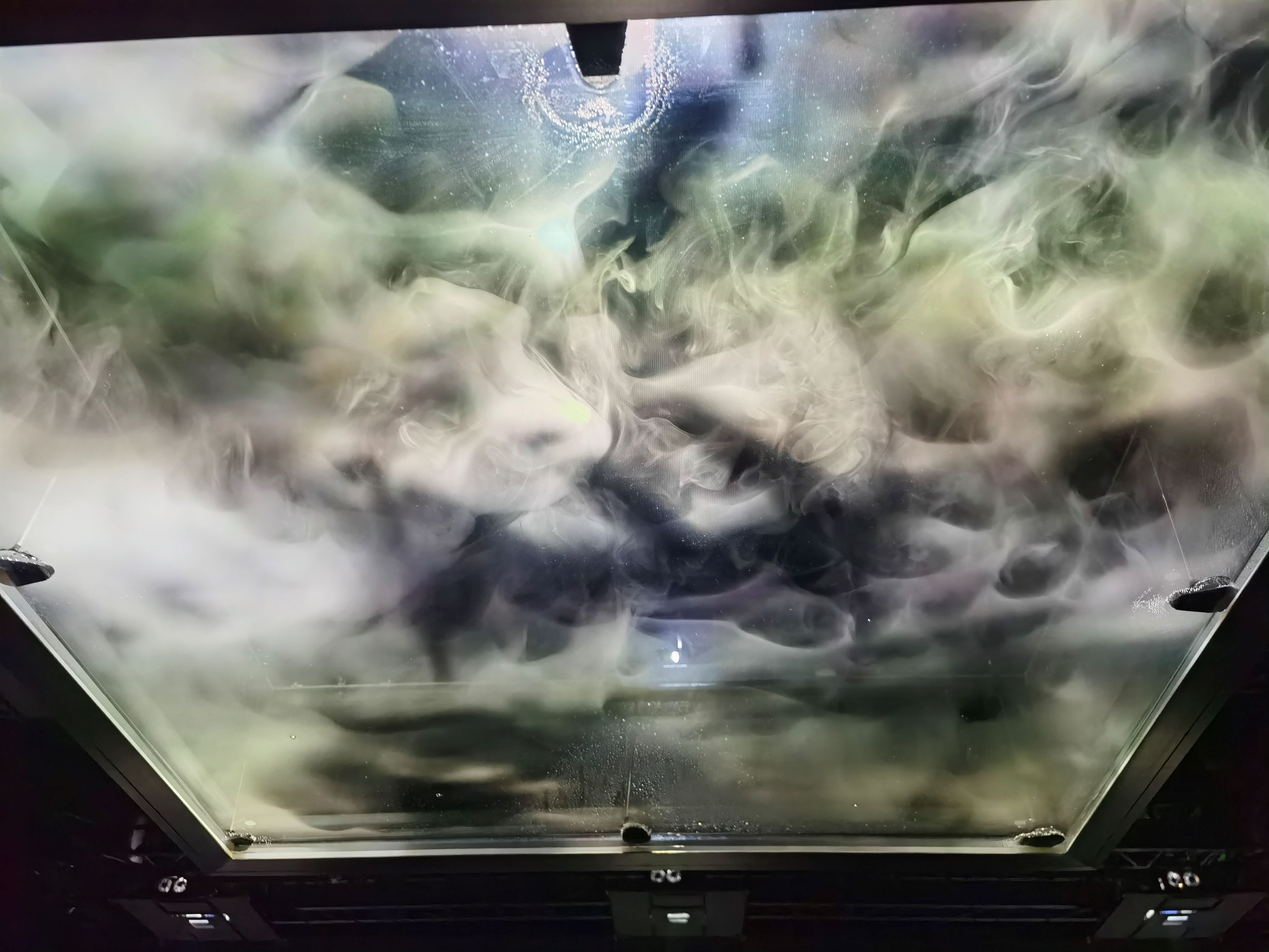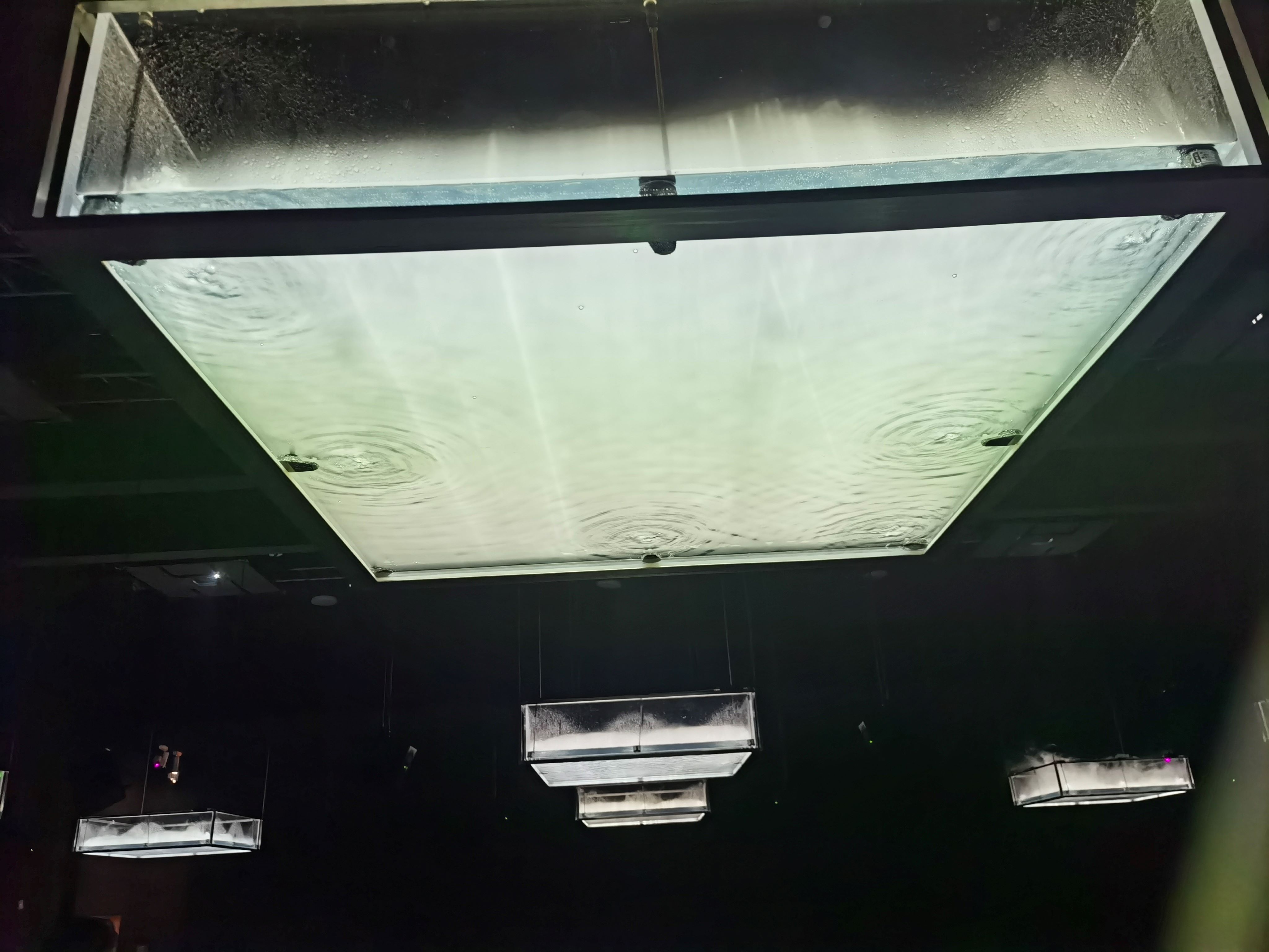 九个水箱构成3x3的方格阵列悬吊在半空中,每个水箱两侧装配有音箱。图像被投射于在水箱中生成的雾气上。浓雾时可以清晰成像,而薄雾时图像则透过水槽,形成在地面上荡漾的光影。