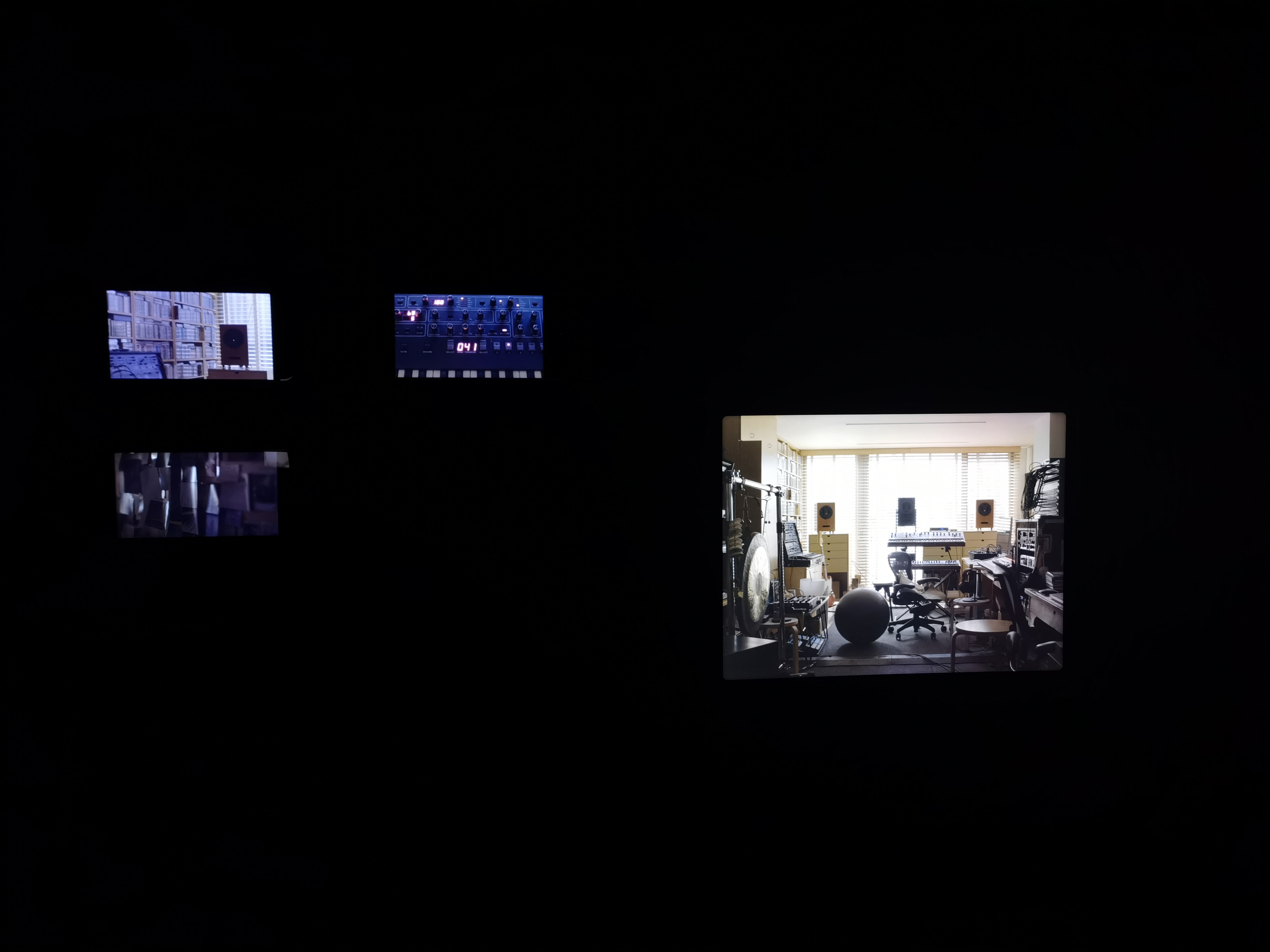 影像呈现了坂本龍一在纽约工作室的钢琴、书籍、谱架、打击乐器以及阳台的植物等。八台显示器中的图像共同构成了一道风景,它们从最右或最左侧的屏幕开始按照一定方向逐渐变化。屏中的图像如织物一般由数不清的细密横线组成,它们一个像素、一个像素地转化着,好似被缓缓扫描过一般,并最终编织成为一幅新的图像。继而,由八块屏幕所构成的图像又反过来一个像素、一个像素地变回原样,直至整个图像被完全分解,化为无数条横线,如岩石的沉积层一般。当堆积的线条覆盖整个画面,它们又开始了向下一个图像的转化。高谷史郎的影像并未与《异步》中的音乐同步。它遵循着自身的时间轴,其视觉表达如潮汐一般不断变化,与专辑音乐中的时间韵律并行呼应。